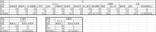 楼主先在无命格的情况下把FC、TM、TG各封印技能放了200次,可以看出三个门派中不同封印技能大体的命中率。然后再分别携带行者阴和鬼童阴把FC的离魂失心又各自放了200次,通过下表可以基本确定行者阴和鬼童阴带来的收益。