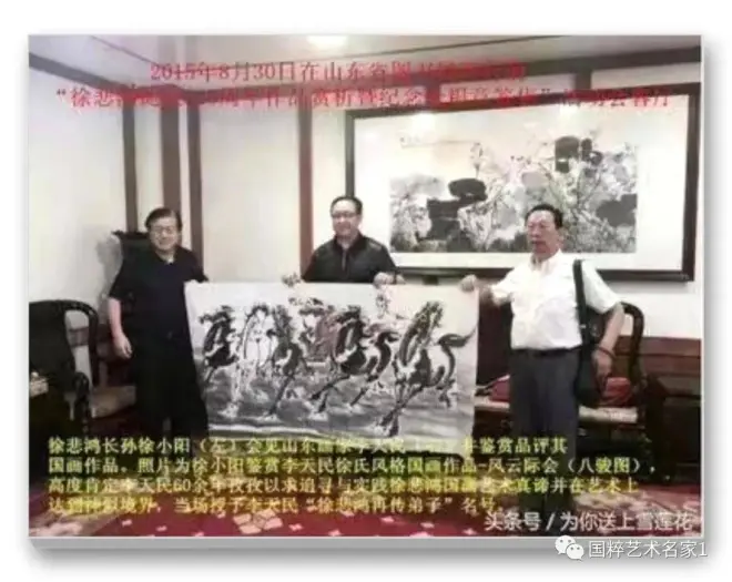 李天民,济南人,中信银行在济南省图书舘举行纪念徐悲鸿诞辰120周年作品赏析暨纪念金银章签售活动现场,徐悲鸿长孙徐小阳看了李天民作品后,当既授予徐悲鸿再传弟子名号。