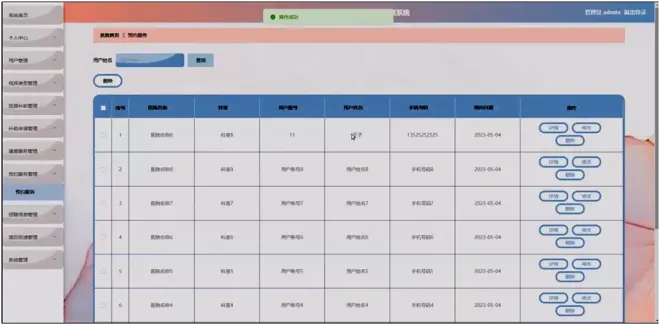 预约服务管理:在预约服务管理页面通过输入相关信息进行查询的操作,并进行详情查看、修改、删除等操作;如图所示。