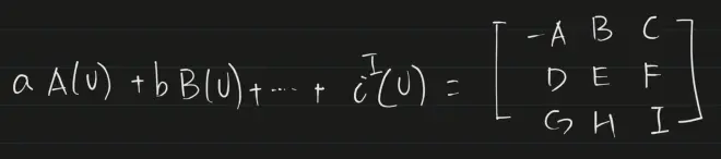 - 设想开关的开与闭就是某种变换,把3*3数阵的元素记为A-I,改变状态就好比添加正负号。