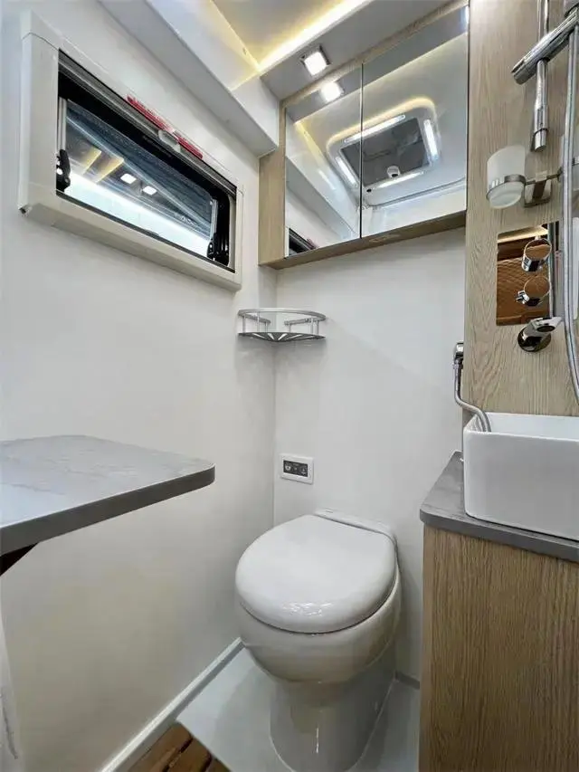 卫生间区域采用一体式设计,内部还装配有赛特福德进口全尺寸游艇陶瓷电动粉碎马桶、卫生间陶瓷面盆+卫生间独立淋浴花洒、LED高清化妆镜+欧式储物镜柜等。固定的洗漱台和陶瓷面盆设计提升内部质感,为车友带来舒适的使用体验。