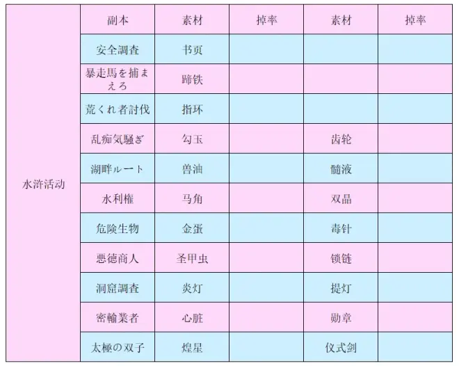 水浒活动:也是没有掉率总结,不过本次活动也是小无限池活动,基本也是住在90++本,关卡掉落的煌星和仪式剑也是短期需求比较高的素材。