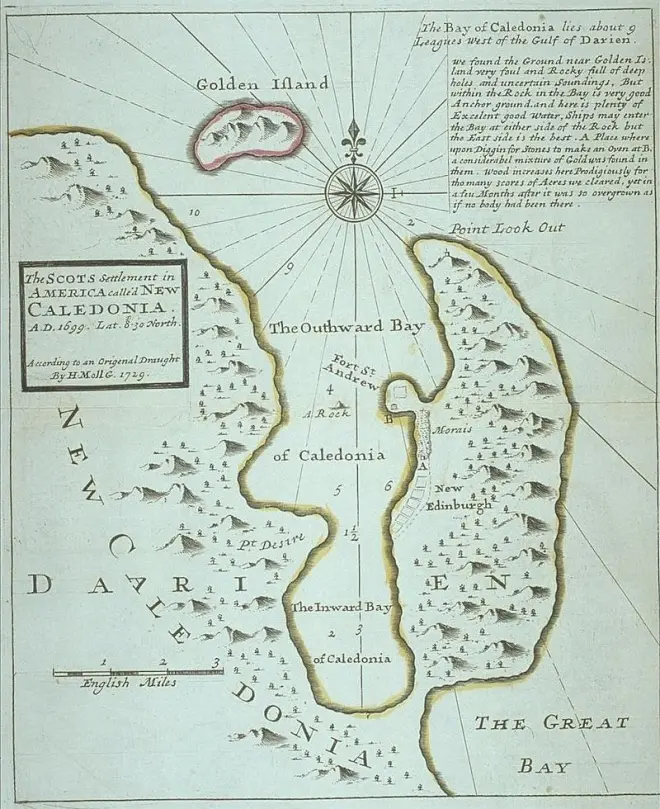 17世纪90年代晚期,苏格兰王国意图在巴拿马地峡和达连湾附近建立被称为“新喀里多尼亚”的殖民地,使得苏格兰成为一个国际贸易国家,称之为“达连计划”。威廉·帕特森组织了一家苏格兰公司,于1698年晚些时候带着大约1,200人在达连河的加勒比海岸登陆。 尽管受到印第安人的欢迎,但殖民者对热带地区的生活以及随之而来的疾病并没有做好充分的准备。 印第安人对他们的商品概念——欧洲服装、假发和英文圣经,也兴趣不大。 这些殖民者在六个月后放弃了计划,等到从苏格兰本土出发的另外1600人抵达巴拿马的“新爱丁堡”时候,他们只看见了成片的墓地,人影都见不到一个,西班牙人通过建立海上封锁来应对这些新来者。最终苏格兰人于1700年4月放弃了这个计划,残余的人则向西班牙军队投降,许多人在这个计划中丧命,主要是由于营养不良和疾病。