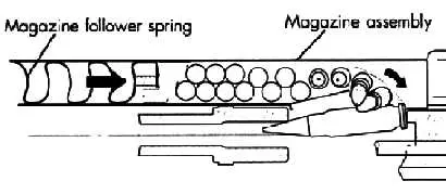 P90的自动方式为自由枪机式,闭膛待击,枪机较重,以控制枪机后坐。发射机构在整体式枪托中,发射机座、击锤、扳机和整体式枪托均为工程塑料件。枪托底板有软橡胶,打开枪托底板里面有附品筒,枪管通条刷头、通条链和油布都放在附品筒内。