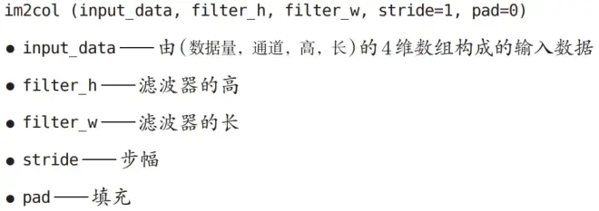 此处提供了im2col函数,并将这个im2col函数作为黑盒(不关心内部实现)使用。im2col会考虑滤波器大小、步幅、填充,将输入数据展开为2维数组。im2col这一便捷函数具有以下接口。