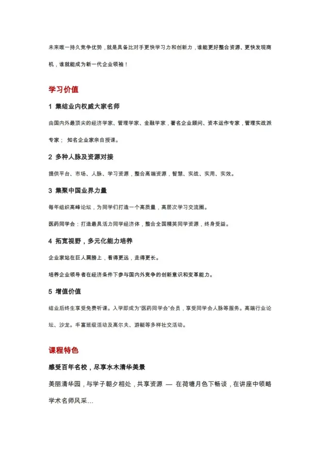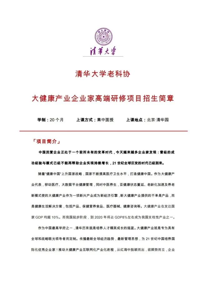 总之,清华大学老科协大健康产业企业家高端研修项目是一个针对大健康产业企业家的高端培训项目,旨在提升企业家的创新能力和核心竞争力,加强企业家之间的交流与合作,为推动大健康产业的快速发展贡献力量。