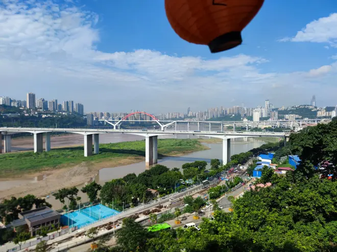 13:46。不愧是魔幻8D山城重庆,从北站到酒店坐轨道交通环线内环,架在半空的地铁体验俯瞰城景江景。