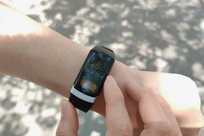 背面是体温传感器、PPG传感器和电极组件,佩戴上之后紧贴在手腕上,可对佩戴者进行血氧、血压、心率、体温、血糖等多种人体参数进行实测,灵敏度高,数据准确率高达95.2%。