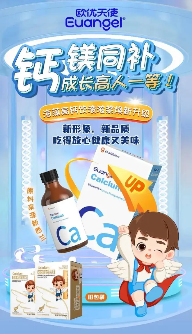 欧优天使的海藻高钙饮液浓浆,海藻钙+甘氨酸钙+柠檬酸钙三种钙结合,还加入了酪蛋白磷酸肽(CPP)以及镁元素,搭配欧优天使的维生素D3,成长高人一等。