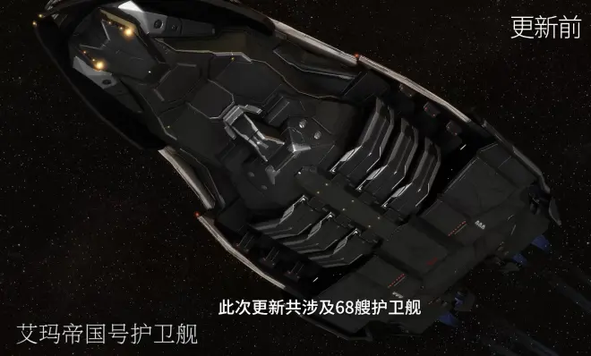 本次资料片共有68艘护卫舰的视觉效果得到了更新,包括添加了根据舰船状态而变化的灯光效果。这样做的目的是让帝国护卫舰在太空中更加璀璨夺目,从而提升这种小而强力的舰船的驾驶体验。同时,保持外观和效果的一致性也很重要,以确保同一帝国的舰船(不仅仅是护卫舰)拥有相同的外观风格。