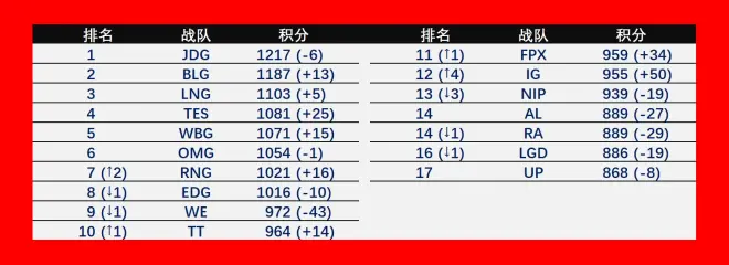 昨天常规赛收官后,ELO积分排名也出来了。 前9名和常规赛排名一致,而以第十名进入季后赛的NIP积分却只排在第13名,低于TT、FPX、IG诸队,和前面的队伍有些断档了。