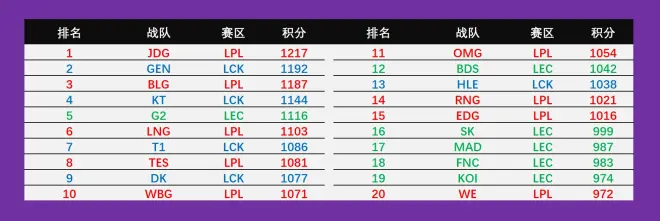 RNG和NIP之间的胜率更是达到了几乎七三开,预测NIP最多啃下RNG1局。 最后是全球三大赛区的战队排名(LPL、LCK、LEC)