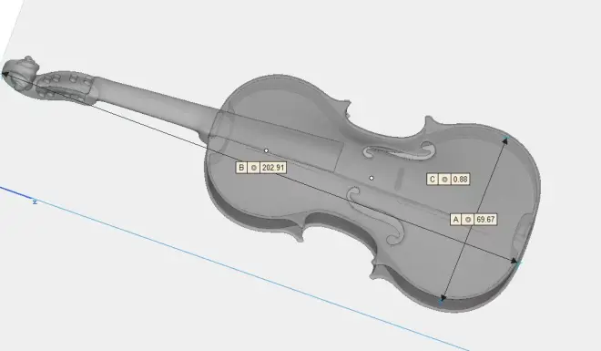 经过与非常工程师的初步沟通,我们打算一起试试3d打印会怎么样。使用Stradivari 1709的原琴建模做一把20cm的未成年小提琴。