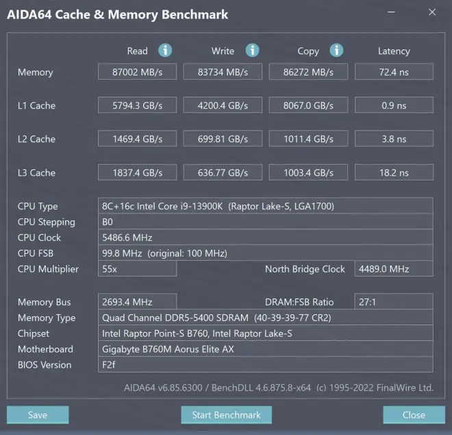 此时可以看到,内存的读取带宽立马提升了13Gb/s,性能提升约18%。而且内存的延迟也降低到了78.7ns,提升约13%。