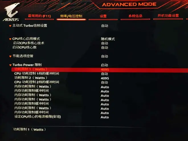建议功率大的CPU可以在这里打开手动设置,功耗1和功耗2全部设定为4095最大,即不限制。避免CPU撞功耗墙导致降速。