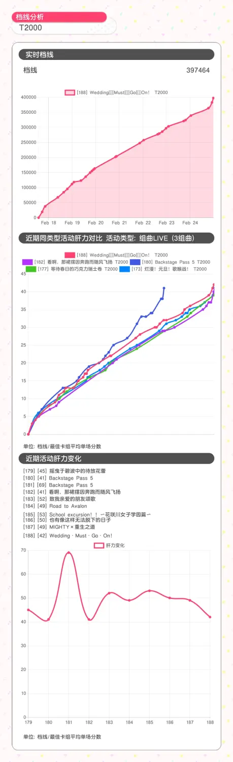 这篇文章提供了不同档线的具体数据,与同类型活动的肝力对比,和近期活动的肝力变化趋势等数据,可以体现不同档线的肝力变化,可以为未来的活动带来更多参考价值。