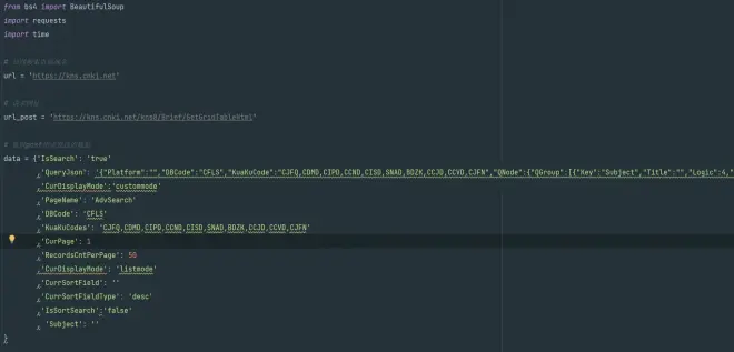 代码主要围绕着requests的post请求展开,将一系列参数定义然后传递进去,其中,data的参数传递,由于python和网页上的代码格式不同,传参时要注意: