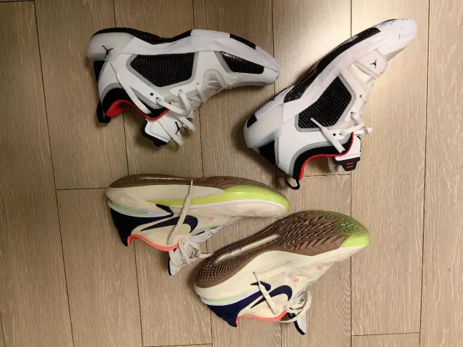 工作结婚以后,随着生活逐步归零,从21年开始又开始了健身和篮球,终于把穿了不知道多少年的库里2换了下来,开始重新关注实战球鞋,这几年买了:AJ37、GTCUT2、AJ34、驭帅14、全城10,感觉都是好鞋,分享下个人的感受。 1、AJ34 当时买了郭艾伦配色,配色像共享单车,鞋舌的文字有点中二,各方面感觉特别好,感觉没有什么缺点,自从ZK4以后再也没穿过那么爽的鞋,打了一年多,什么场地都上过,直接把气垫踩爆了才完成使命光荣退役