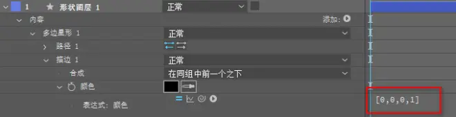 随便绘制一个星形,展开【描边】属性,按住ALt键的同时单击【颜色】前面的码表,在表达式编辑栏输入【0,0,0,1】,星形便会变为黑色。