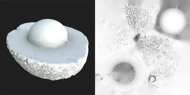 以这个蘑菇为例:传统的置换贴图只能做到改变其高度,但是用矢量置换贴图可以实现更接近原始造型的效果。