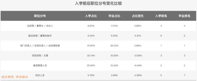 在入学前后职位的变动上,普遍会从基层管理实现向中层和更高岗位的晋升,对于职业的帮助也是比较明显的正面影响。
