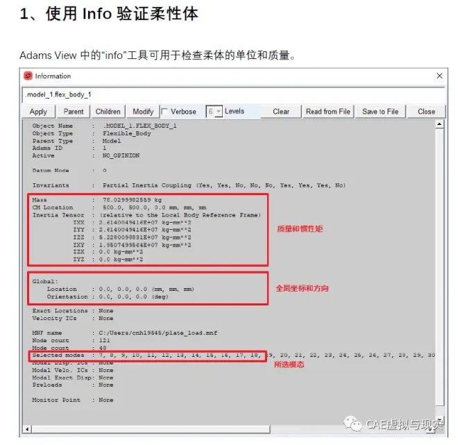 将MNF或MD DB导入Adams View后,可以使用“info”工具检查有关弹性体的相关数据。