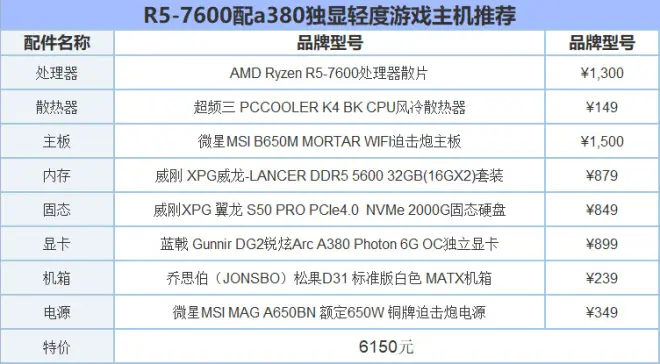 我们能够看出在这套配置中非常讲究发布时间呢!虽然并不算严格意义上的准3A平台,那至少也是2A的节奏,Arc A380 6G独立显卡再怎么说也是后起之秀,再加上DDR5双通道配PCIe4.0高速SSD,性能发挥还是很值得期待的。