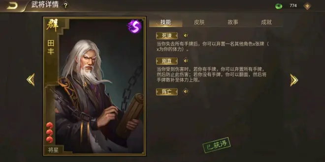田丰(S),死谏,在失去所有手牌后可以弃置其他角色的牌(濒死的时候失去所有手牌,由于体力值为0,不能弃牌)。刚直,受到伤害时可以弃置手牌,防止伤害;如果没有手牌,可以翻面,将手牌数至体力上限。换言之,只要有手牌就不会受到伤害(怕锁技能或时机是造成伤害时的技能),可以搭配神甄姬、董白、步骘、SR陆逊、陆逊、张布。