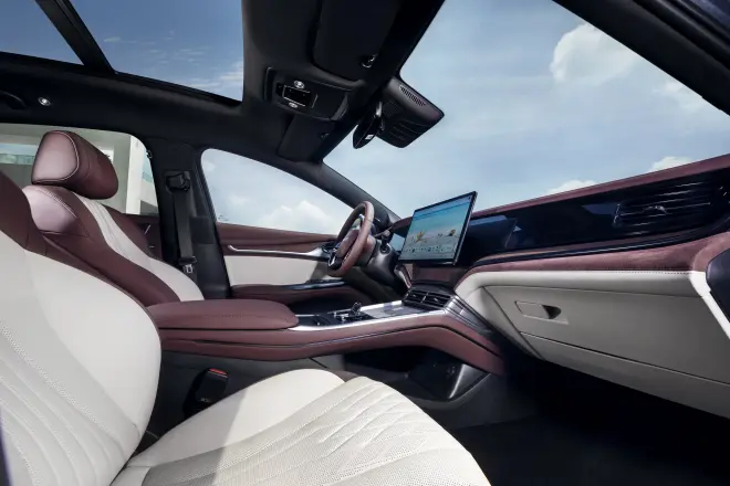 仪表台区域的线条与门板的主体线条相连,车门与仪表台融为一体,营造出带有环抱感的座舱氛围。车内门把手均采用圆角设计,工艺精湛且触感极佳,于细微处提升座舱优雅气息。