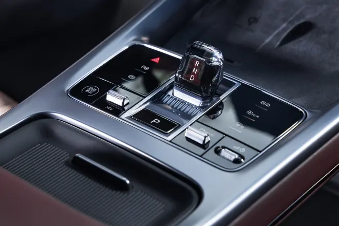 海豹DM-i的中控面板延续了海洋系列的布局形式,精致的水晶挡杆作为视觉核心镶嵌其中,与机械按键共同构成“海洋之心”控制中枢。“海洋之心”集成了包括启动按键、动力模式选择、驾驶模式选择、空调与音响控制等常用功能,操作简洁、方便。水晶挡杆下部的按键与滚轮采用了铝金属色密齿梳造型,带来强烈的机械质感和高级观感。