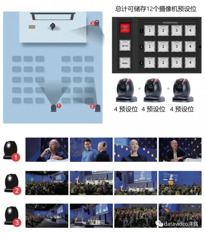 SHOWCAST 100可以连接三台云台摄像机,每个云台摄像机可以预设4个拍摄机位,一共能够储存12个机位,导播人员可以按下相应的12个记忆预设键,可快速执行各种不同角度实时切换,三台云台,达到12个机位,极大方便现场机动性,对于会议发言者的画面以及现场的参会人员的拍摄画面,以及画面构图都可以快速的切换,从而快速准确稳定的直播出去。