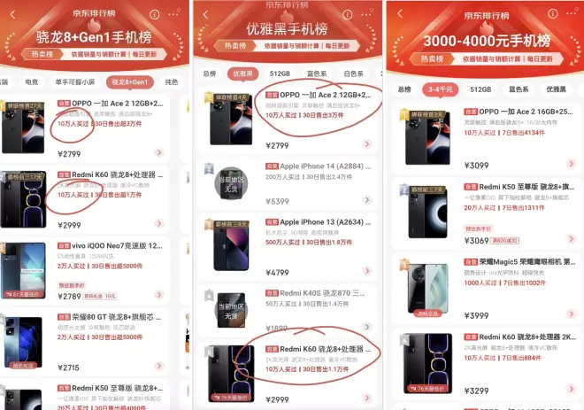 凭借着标配12+256GB大内存,满血版的骁龙8+处理器,以及2799元起售价,一加Ace2成为了当下的爆款手机,仅开售一个月,一加Ace2便在京东平台上收获了10W+评价!要知道同价位的另一款明星产品K60花了差不多2个月才到10W+的评价。除此之外,一加Ace2V同样是备受消费者“真香”的评价,而这两款产品也让Redmi的K60、K60E频频降价,可以说真的很急了。
