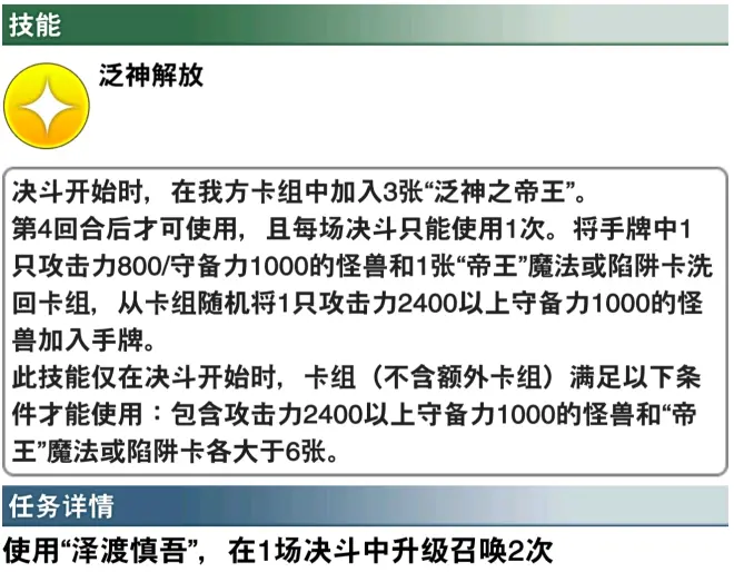 这个技能的主要目的在于添加「泛神的帝王」入卡组,变相相当于实装了「泛神」,但阻止其过分外挂并增加投入卡组厚度从而一定程度上降低稳定性。