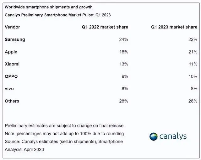 随着消费者换机周期逐渐延长,这几年全球市场需求逐步趋向于「逆势增长」。据国际知名调研机构Canalys公布的最新数据可知,2023年Q1季度全球手机市场出货量同比下降了12%,具体厂商出货排名上相较于去年同期出现了不同程度的下降。但也有着例外,像国产头部厂商OPPO就在行业逆势下实现了增长,以10%的市场份额占比跻身全球榜单第四。