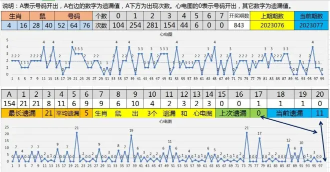 4、生肖鼠(04,16,28,40,52,64,76)的综合开出号码个数心电图以及鼠开3个号码的心电图,如下: