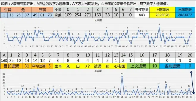 1、生肖兔(01,13,25,37,49,61,73)的综合开出号码个数心电图以及兔开3个号码的心电图,如下: