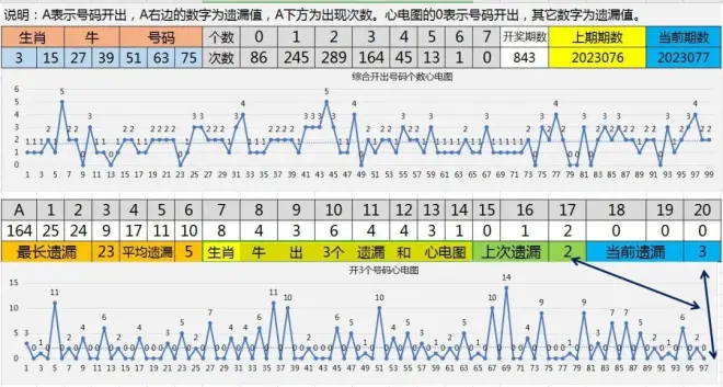 3、生肖牛(03,15,27,39,51,63,75)的综合开出号码个数心电图以及牛开3个号码的心电图,如下: