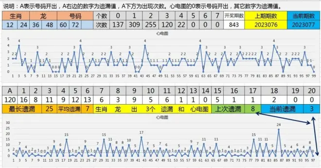 12、生肖龙(12,24,36,48,60,72)的综合开出号码个数心电图以及龙开3个号码的心电图,如下: