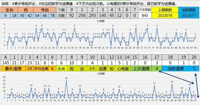 6、生肖狗(06,18,30,42,54,66,78)的综合开出号码个数心电图以及狗开3个号码的心电图,如下: