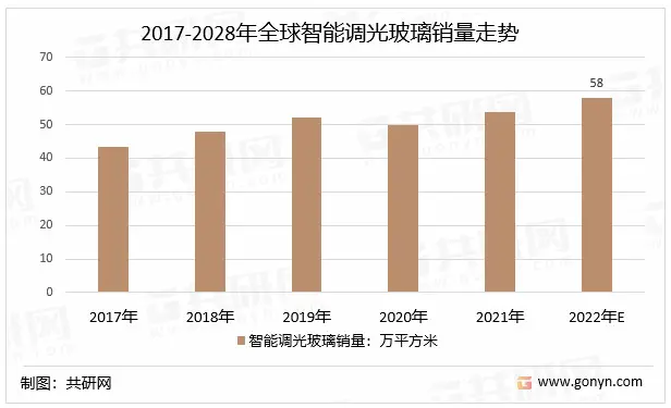 从全球智能调光玻璃销量方面来看,2017年全球智能调光玻璃销量为43.21万平方米,至2021年,全球智能调光玻璃销量增长至53.78万平方米,预计2022年约为58万平方米。