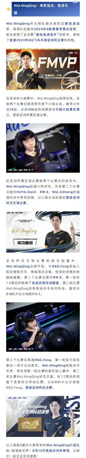 2023年QQ飞车手游亚洲杯总决赛将于8月12日在南昌洪州体育馆燃擎开赛,中国大陆赛区的RSG.Feng、Wol.NingQing、HUYA.DanZ和境外赛区的HeiRen脱颖而出,出征亚洲杯总决赛!S酱为赛车手们准备了新鲜出炉的亚洲杯总决赛选手巡礼,今天就一起来了解一下Wol.NingQing吧~
