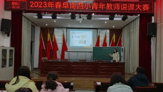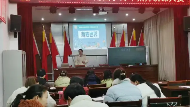 阜南四小全体语文教师齐聚一堂,认真聆听青年教师说课。本次语文组说课课题分别是三年级下册的《海底世界》和四年级下册的《白鹅》。参赛选手认真准备,精心设计说课流程,锤炼语言,制作课件,比赛现场精彩不断。