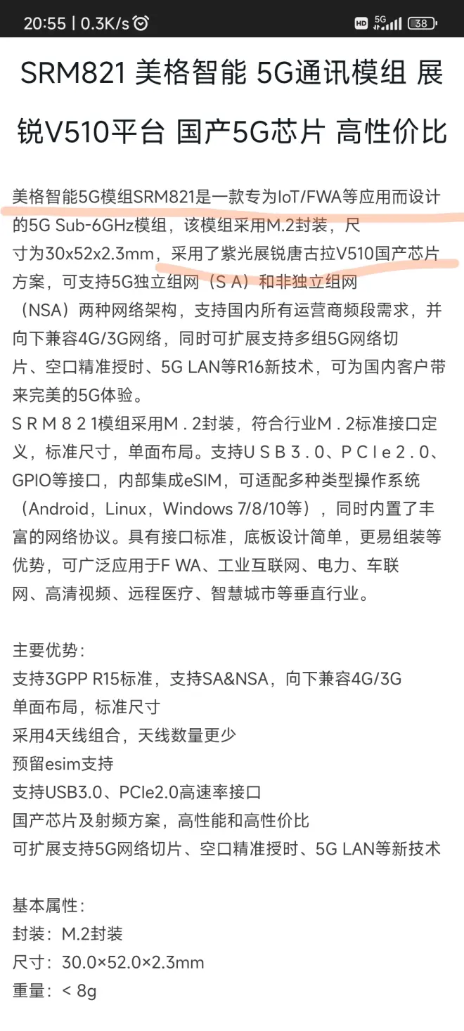 在拼夕夕上看到一款独一无二的搭载展锐 710 5G 芯片的 5G CPE ,按捺不住心中的好奇加上确实需要一款 5GCPE,下单了一个,到手之后发现和宣传的型号不一样,反复找客服确认,我买的可是 搭载展锐 710 的产品 ,如果掉包我可不乐意,客服肯定的告诉我货没发错,宣传图搞错了,既然没错的话我就要见识见识展锐 710 长什么样子🕵️♂️,拆开后大失所望,5G 模组为基于展锐5G基带V510的美格智能 SRM821,WIFI 和华为 AX2pro 一样的螃蟹全家桶套餐,网上搜不到产品信息,退货退款扯皮中,店家不承认货有问题,参数是厂家提供,给了一个厂家固话,让打电话联系咨询, 正在申请拼夕夕介入