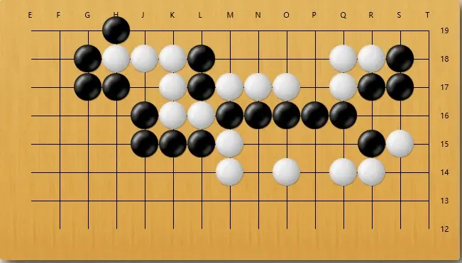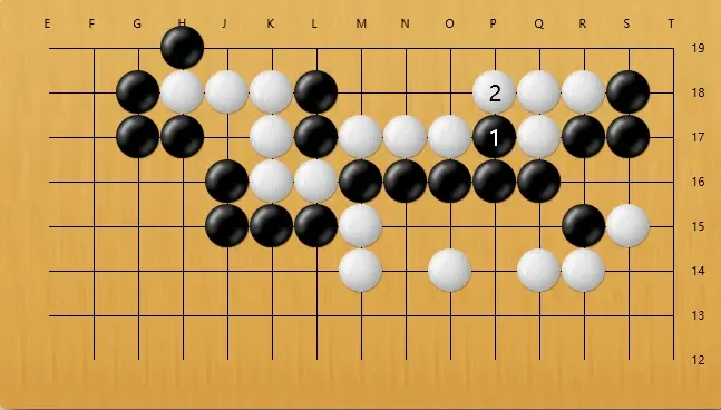 2) 正解:利用白气紧的问题,单立一个,形成如下金鸡独立的形式,黑棋当初在O18断的这个子刚好发挥了作用,白棋右边不入气,这样黑棋就吃掉了白棋左边的子