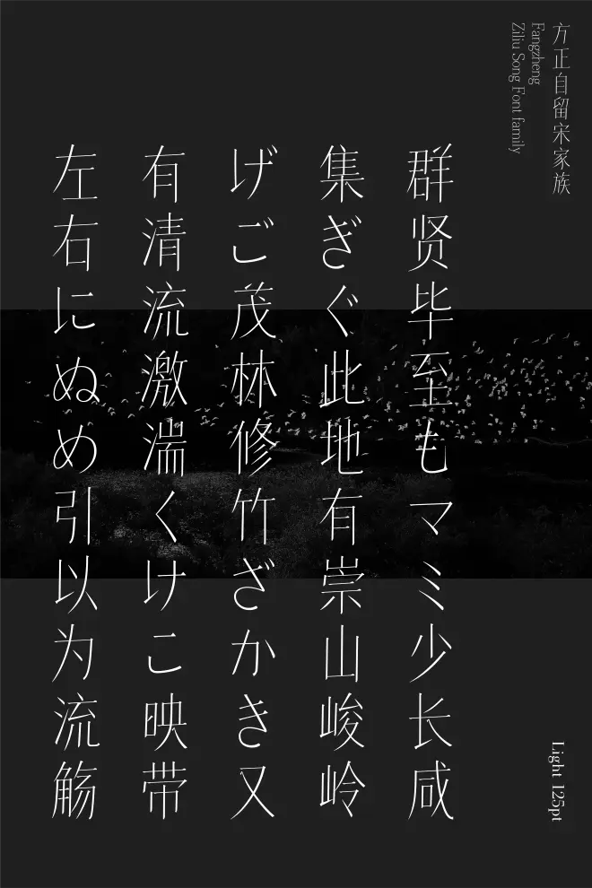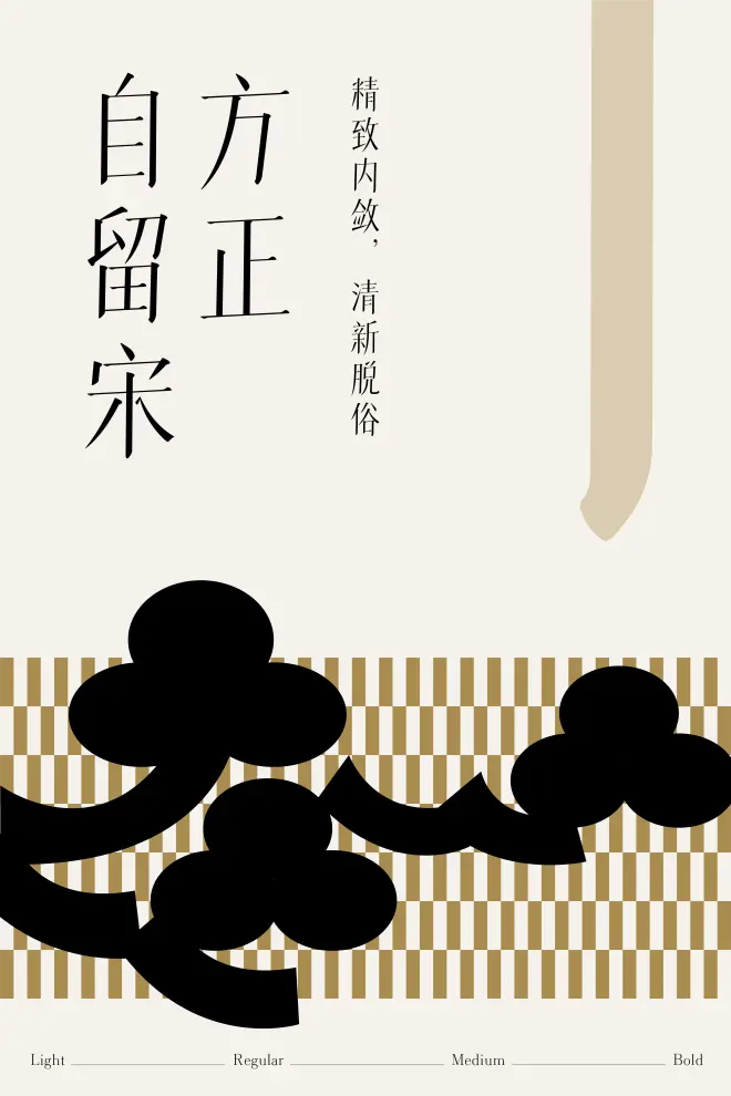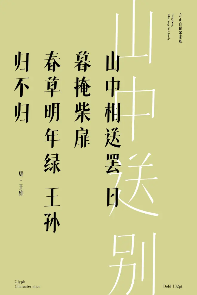 方正自留宋,命名取自唐代“诗佛”王维的诗作《山居秋暝》——「随意春芳歇,王孙自可留」,是一款取法于传统书法,并结合当下流行审美及字体设计趋势创作而成的创意宋体字。字体乍看潇洒飘逸,实则紧致凝炼;气质清冷凛冽、姿态亭亭玉立,恰好呼应了王维诗中“不恋宦海,喜归自然”的君子之姿。方正自留宋家族包含Light、Regular、Medium、Bold 4款字重,适用于时尚、美妆、艺术、文化、旅游等领域的广告和产品包装设计。