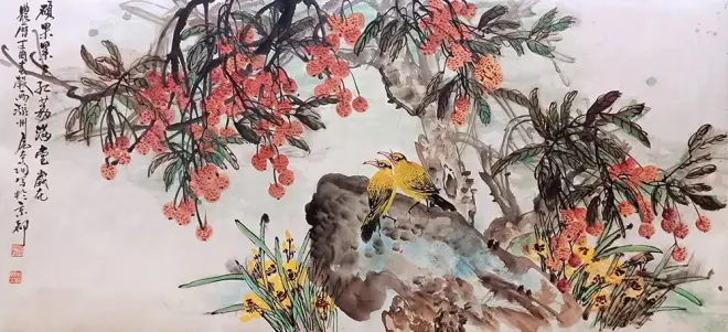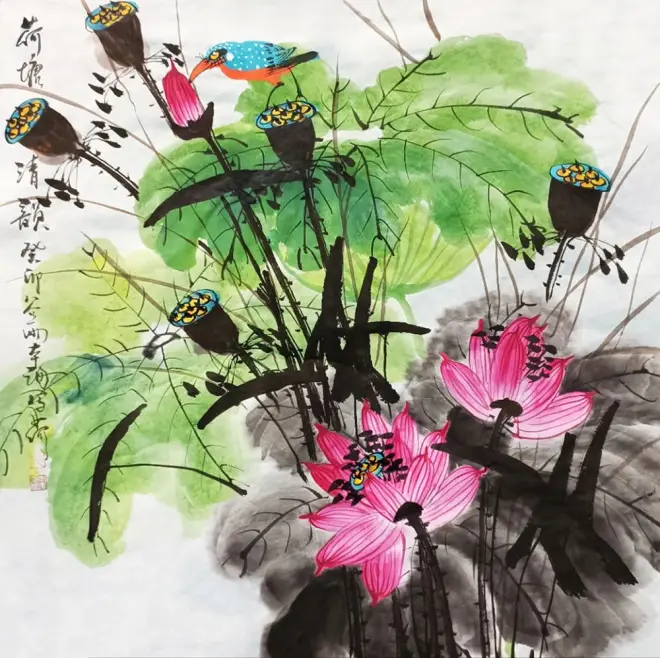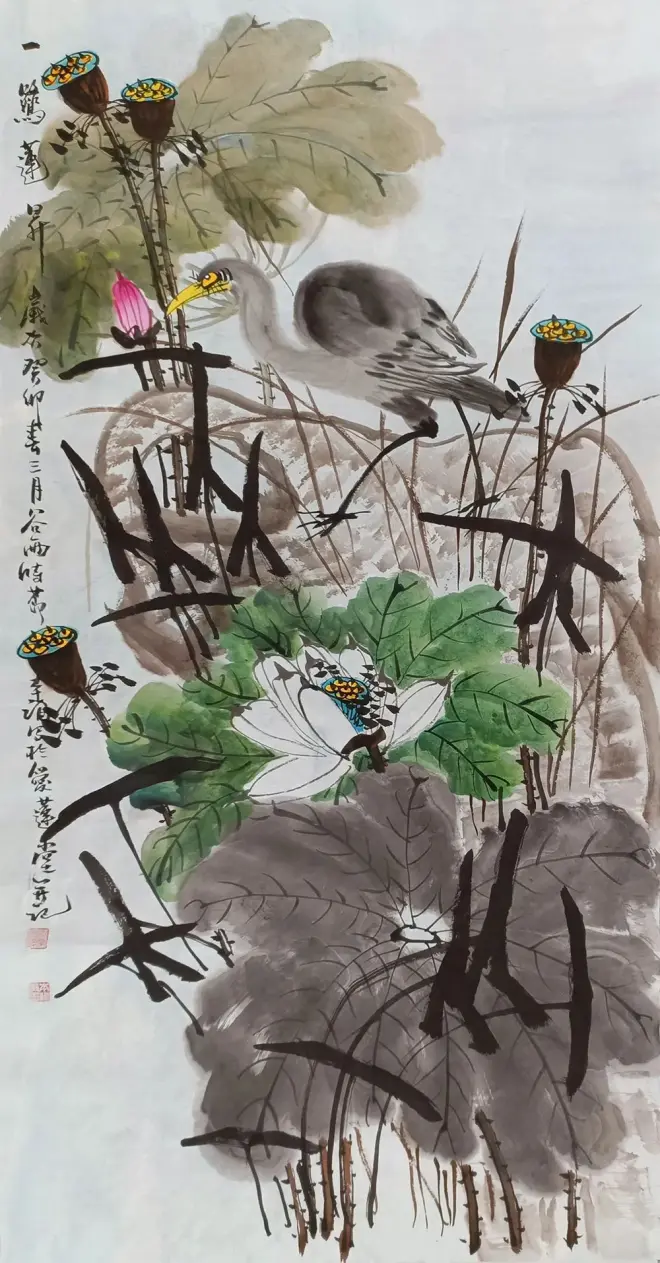 他治艺态度严谨,视艺术如生命,大胆探索,把西方重彩与东方浓墨相结合,在现代写意花鸟画的题材上和技法上进行了系列创新。以多元化的笔墨语言为中国画注入了新鲜血液,是传统笔墨在新的变革中得以激活,为现代花鸟画提供了新的思路和样本,使我们感受到中国传统文化的生命力。也体现了一位在海外奔波多年、有东西方双重生活阅历的艺术修养,对艺术执着追求的艺术大师强烈的民族自信心和旺盛的艺术创造力。