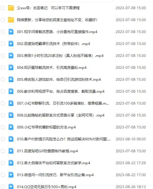 下面给大家总结了一套全网引流思路,这些引流视频都是古圣原创录制的,自己实操可行的哦,思路也是包更新的!!!