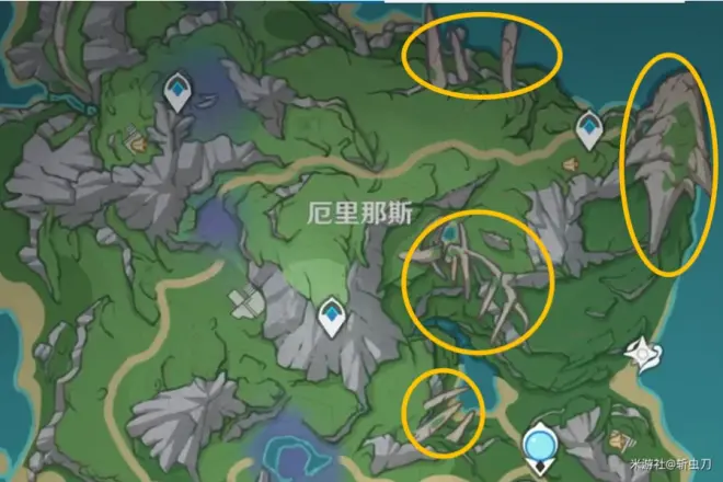 由图可知,这块地方名叫“厄里那斯”。值得注意的是,这里的山石看上去并不寻常,细长而尖锐,很像是某种巨兽的遗骸。