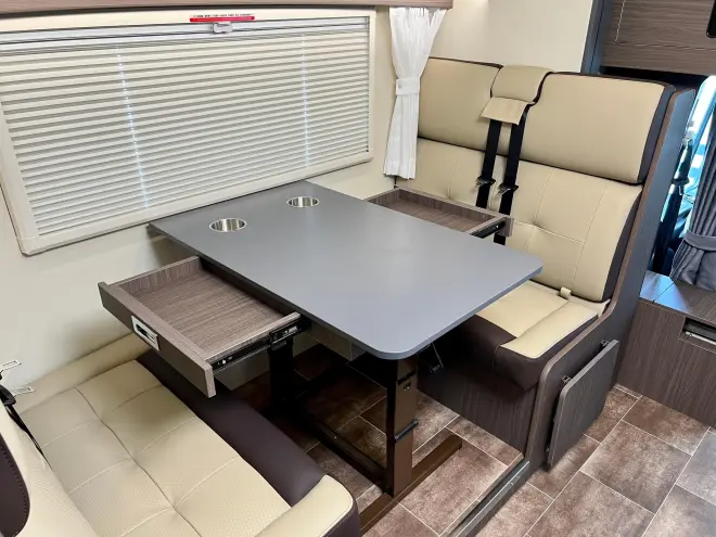 会客区采用双人对坐沙发设计,中间配备可升降餐桌,不用的时候可将餐桌降下,就变成一张1900x1000mm的单人床位。中间搭配合世壁百褶窗,既通风透气也可遮挡蚊虫。墙壁上的大菱形格的内饰加上淡黄色灯光,让会客区的氛围增添了几分柔软。厨房区配备有便携式米家智能电磁炉、松下微波炉和多个储物柜,可在室内做点简餐,也可与室外厨房配合使用,享受露营野餐的乐趣。当然出门旅行的时候也可以自带充足的食材和饮品,152L的塞特福德冰箱完全放得下,冷藏冷冻均可。其他配置方面,配有房车智能控制系统、三菱重工1.5P静音变频投影面板空调、4路监控,32寸电视(车头翻转)、进口卡洛西行车冷暖风机、行车冷暖风+驻车燃油燃油暖风系统等。