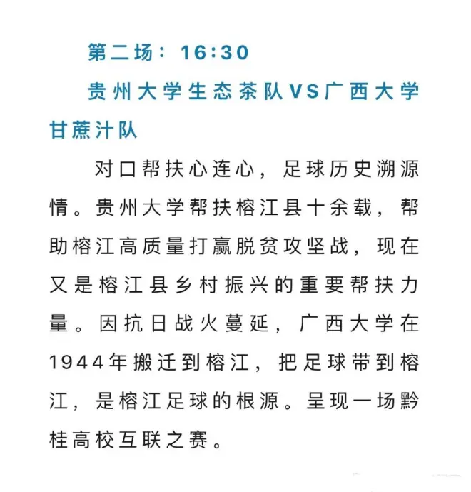 第二场比赛是贵州大学生态茶队与广西大学甘蔗汁队的较量,这场比赛将展现出对口帮扶的深厚情谊和高校间的紧密联系。通过足球,让我们一起追溯历史,感受黔桂之间的深厚情谊。